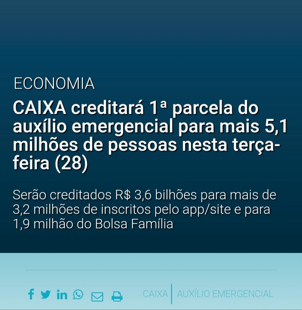 A CAIXA disponibilizará mais R$ 3,6 bilhões do Auxílio Emergencial para 5,1 milhões de beneficiários nesta terça-feira (28). Deste total, R$ 2,1 bilhões já disponibilizados pelo Ministério da Cidadania serão destinados para mais 3,26 milhões do total de elegíveis que se inscreveram pelo aplicativo CAIXA | Auxílio Emergencial e pelo site auxilio.caixa.gov.br. Mais de R$ 1,7 bilhão serão creditados em contas da CAIXA e R$ 341.409.600 em contas de outros bancos.