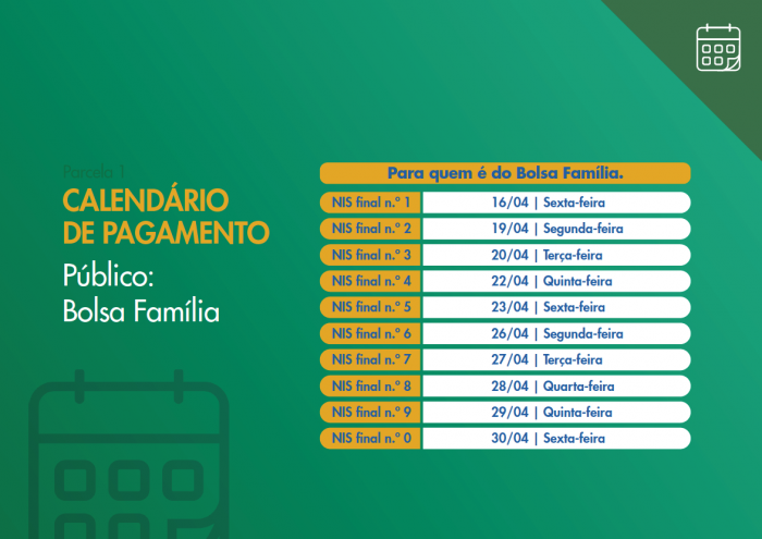 O primeiro pagamento do Auxílio Emergencial 2021 para os beneficiários do Bolsa Família será no dia 16 de abril.