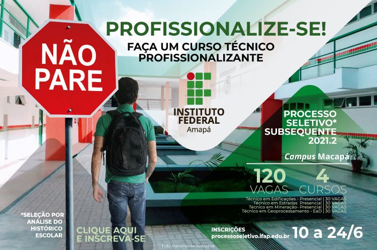 O Campus Macapá do Instituto Federal do Amapá (Ifap) oferta quatro cursos técnicos subsequentes – Edificações (30 vagas), Estradas (30 vagas), Mineração (30 vagas) e Geoprocessamento (30 vagas) – através do Edital nº 7/2021 do Processo Seletivo Subsequente. Os cursos são direcionados às pessoas que já possuem o ensino médio e agora desejam uma habilitação profissional e técnica. As inscrições acontecem de 10 a 24 de junho. Clique aqui para ler o edital.