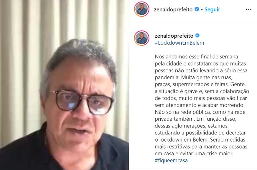 “Nós andamos esse final de semana pela cidade e constatamos que muitas pessoas não estão levando a sério essa pandemia. Muita gente nas ruas, praças, supermercados e feiras. Gente, a situação é grave e, sem a colaboração de todos, muito mais pessoas vão ficar sem atendimento e acabar morrendo. Não só na rede pública, como na rede privada também. Em função disso, dessas aglomerações, estamos estudando a possibilidade de decretar o lockdown em Belém. Serão medidas mais restritivas para manter as pessoas em casa e evitar uma crise maior.”