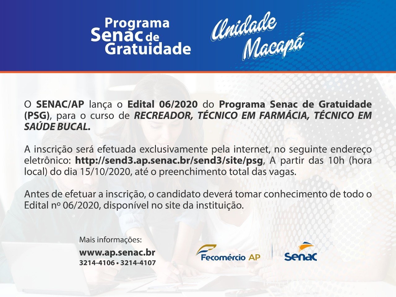 O SENAC/AP, visando selecionar interessados em ingressar em cursos pelo Programa Senac de Gratuidade (PSG), torna público Seleção de Candidatos para os cursos de Recreador, Técnico em Farmácia e Técnico em Saúde Bucal.