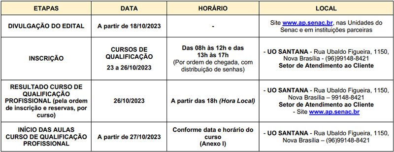 O SENAC/AP, unidade Santana, visando selecionar interessados em ingressar em cursos pelo Programa Senac de Gratuidade (PSG), torna público que promoverá Seleção de Candidatos, para os seguintes cursos: