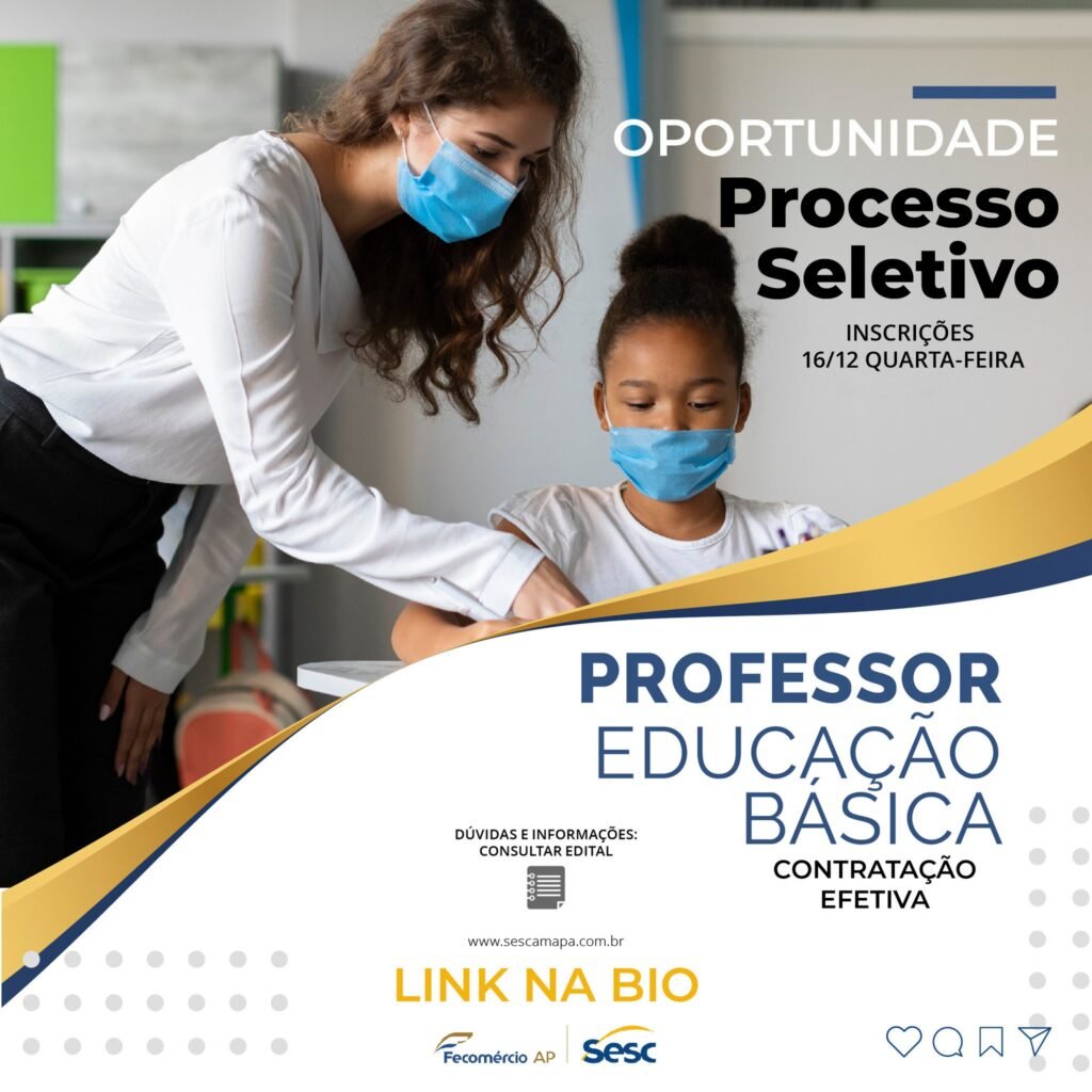 O Serviço Social do Comércio – Sesc torna público que estarão abertas as inscrições para o PROCESSO SELETIVO destinado a selecionar candidatos para preenchimento de vaga e formação de cadastro reserva contratação ao quadro efetivo, do cargo de PROFESSOR EDUCAÇÃO BÁSICA para lotação na unidade no município de MACAPÁ/AP.