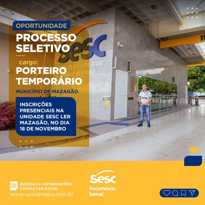 O Serviço Social do Comércio – Sesc, Departamento Regional Amapá, divulga abertura de inscrições do Processo Seletivo nº 032/2021 para o cargo de PORTEIRO – Temporário, com lotação na cidade de MAZAGÃO/AP.