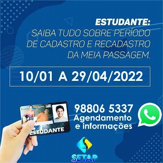 O Sindicato das Empresas de Transporte de Passageiros do Amapá (Setap) inicia nesta segunda-feira, 10 de janeiro, o cadastramento e recadastramento da meia-passagem. O trabalho de recadastro (para quem já tem o benefício) e de cadastro (novos beneficiários) vai se concentrar na sede do Setap, na Padre Júlio, entre Tiradentes e General Rondon, e prosseguir até o dia 29 de abril, das 8h às 17h.